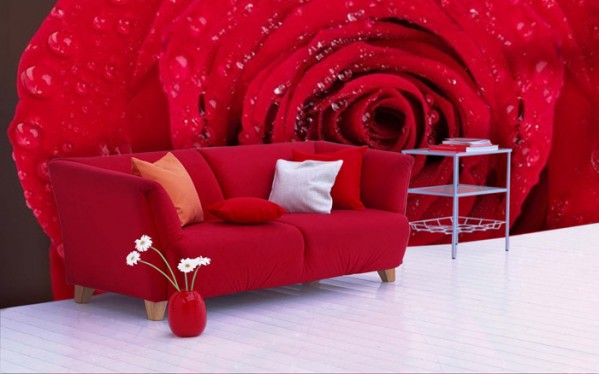 Еще один способ создать в квартире ощущуение другого масштаба при помощи фотообоев — использовать сильно увеличенные изображения чего-то, что на самом деле очень маленькое. Например, цветы. Представьте, что на стене у вас изображена роза с капельками росы. В подробностях видны все складки лепестков, и в каждой капле играет солнечный блик. Когда находишься в комнате с таким принтом во всю стену, буквально ощущаешь себя маленькой пчелкой над свежим утренним лугом. Очень красивая иллюзия.